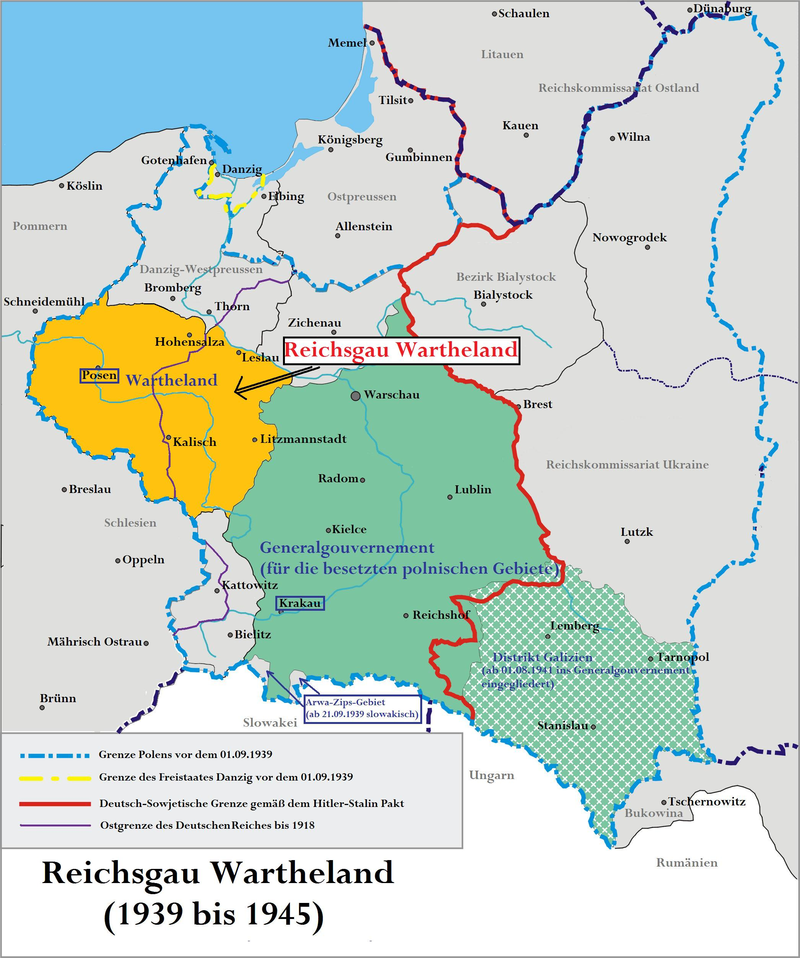 Reichsgau Wartheland, also called Warthegau, was a National Socialist German administrative district formed in 1939 from what had been Polish territory for the past 20 years, granted by the Versailles Treaty following WW1. The name derived from the main river, Warthe; the capital city was Posen. The Gauleiter (Party leader of a Gau or District) of the Warthegau from '39 to '45 was Arthur Greiser.