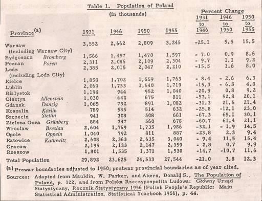 On page 413 of the book "Poland: It's People, It's Society, It's Culture" by Clifford Barnett, HRAF Press, New Haven, CT 1958, the following figures are marked at chart #1: For the year 1950, a population of 24,533,000; for the year 1955, a population of 27,544,000.