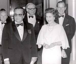 The Queen pictured with Yugoslavian president Josip Tito, front left, in 1978 after hosting him at Buckingham Palace. Behind are Labor Prime Minister James Callaghan (later 'Lord Cardiff') and Prince Philip. Tito was supported by the British in the war, and its representatives turned thousands of fleeing German, Croat, Slovene and Cossack forces back to Tito's partisans in 1945, knowing they would be killed.
