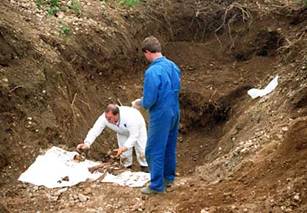 In the case of this latest and largest mass grave (2008), no clothing, eye glasses or gold teeth were found. It thus appears that they were completely stripped before they were killed. The skeletons that were laying on top had bullet holes in their heads, indicating they may have dug the grave and put the dead in it before they themselves were added.