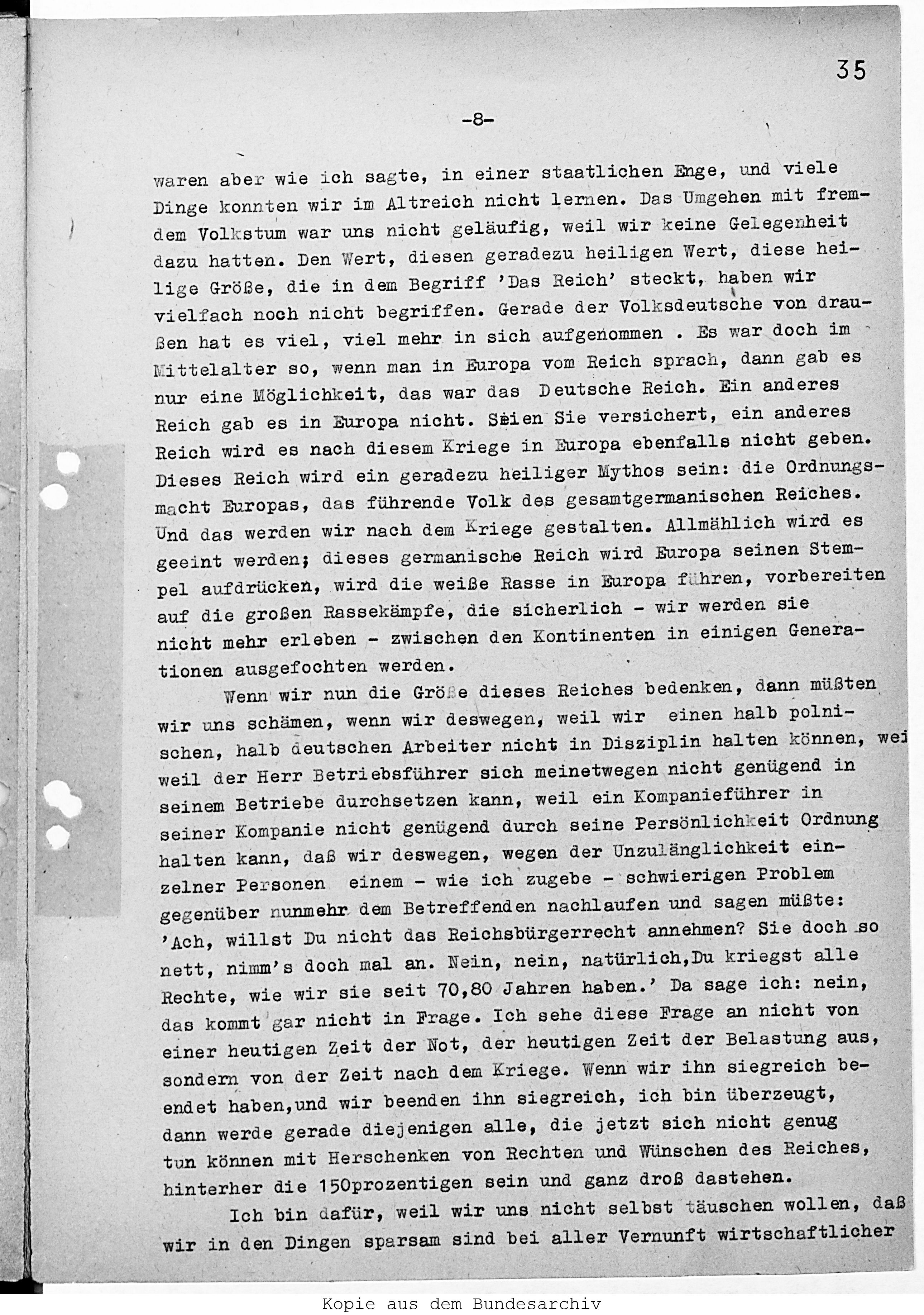 Und das werden wir nach dem Kriege gestalten und schaffen. Allmählich wird es geeint werden; dieses germanische Reich wird Europa seinen Stempel aufdrücken, wird die weisse Rasse in Europa führen. [The last sentence is missing.]
